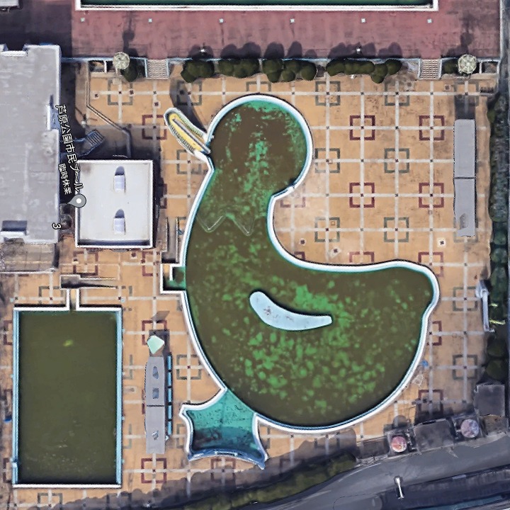 ここは芦原公園の市民プールです。幼いころ何回も行ったことがあるはずなのに、全体がアヒルの形をしているとは知りませんでした。