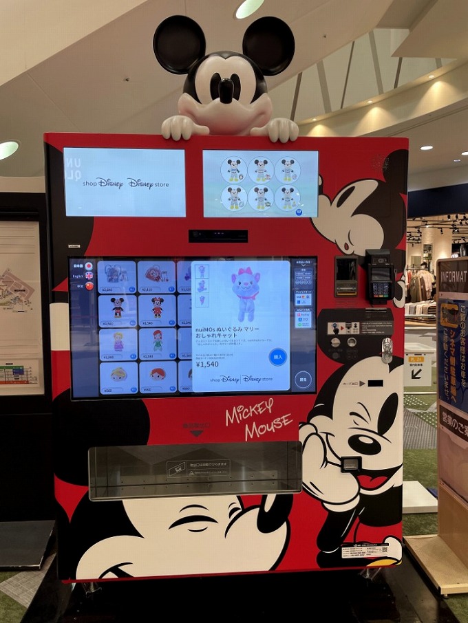 ディズニーの公式ショップである「ショップディズニー」が設置しているオリジナル自動販売機。キャラクターのぬいぐるみが売っています。「ゲストのみなさまに身近でいつでもアクセスできる環境を実現するため」というコンセプトから設置されたそうです。
