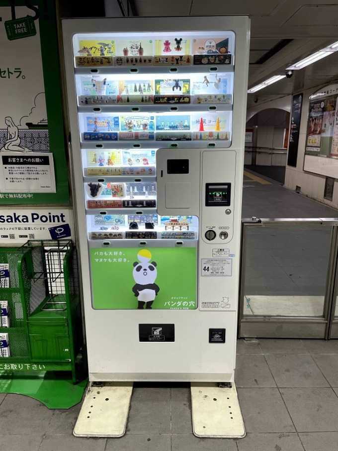 大阪メトロ御堂筋線梅田駅の北改札付近にあったコレ。一見普通の自動販売機に見えますが、じつはガチャガチャなんです!